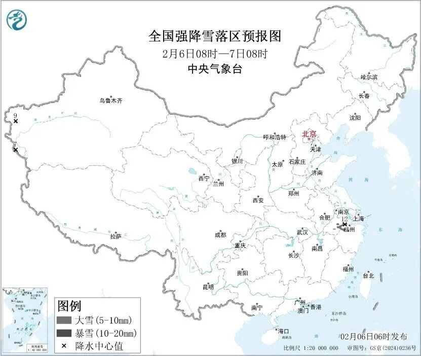 预计2月6日8时至2月7日8时,安徽南部、浙江北部等地部分地区有大雪。其中,浙江西北部等地部分地区有暴雪(10至12毫米)。上述部分地区新增积雪深度3至5厘米,局地可达8厘米以上。